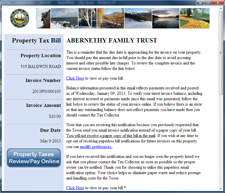 - For a sample page illustrating the “View PDF” button with a PDF tax bill you can go HERE. (Note that you’ll need to search for someone in the town — just use and of the “Smiths”.)