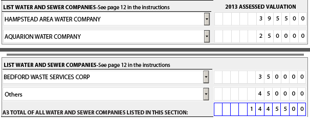 First, the problem. If you have more than three Gas Utilities and/or more than four Water Utilities that are reported under the Utilities Summary (DRA MS-1 PDF, pages 4-5) the system is exporting the wrong assessment values in the XML file for the utilities that, due to a limited number of possible entries, need to be grouped together on the final line of each subsection. For reference, the corresponding Gas and Water Utility subsections are pictured below.
