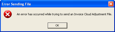 The error message box indicates that there was an error sending an Invoice Cloud Adjustment File and it looks like this: